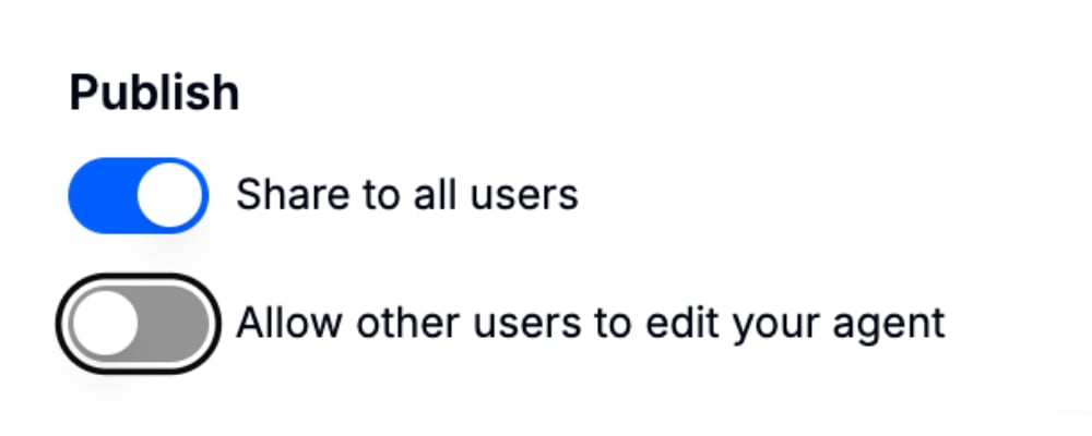 Allow other users to edit your agent: This allows teammates collaborate by editing your agent’s configuration. When off, only you can make changes.