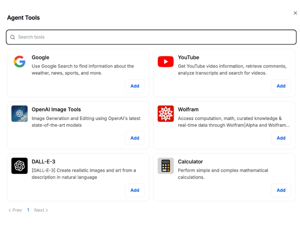 Connect your agent to powerful external services like Google search, image generation, calculations, and more. Select only the integrations relevant to your workflow to keep your agent focused and your interface clutter-free.