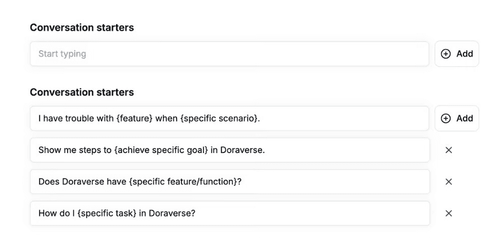 Set initial prompts that your agent uses to kick off conversations. These starters help shape the purpose right from the first interaction, making it easier for users to engage effectively.