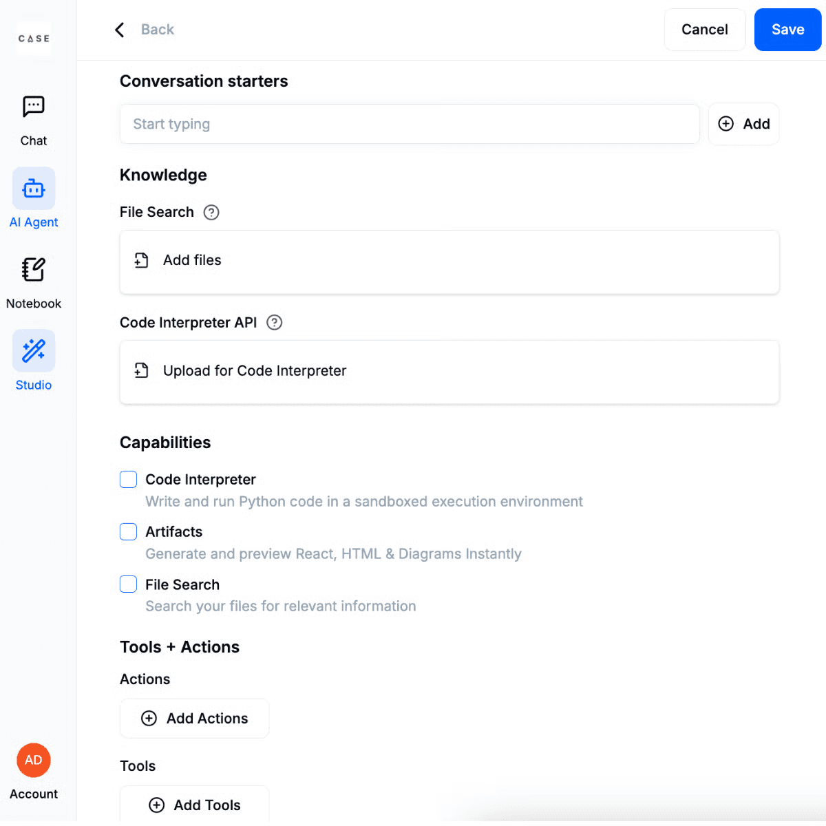 Advance Settings: Conversation starters, Knowledge, Code Interpreter API, Capabilities, Tools + Actions