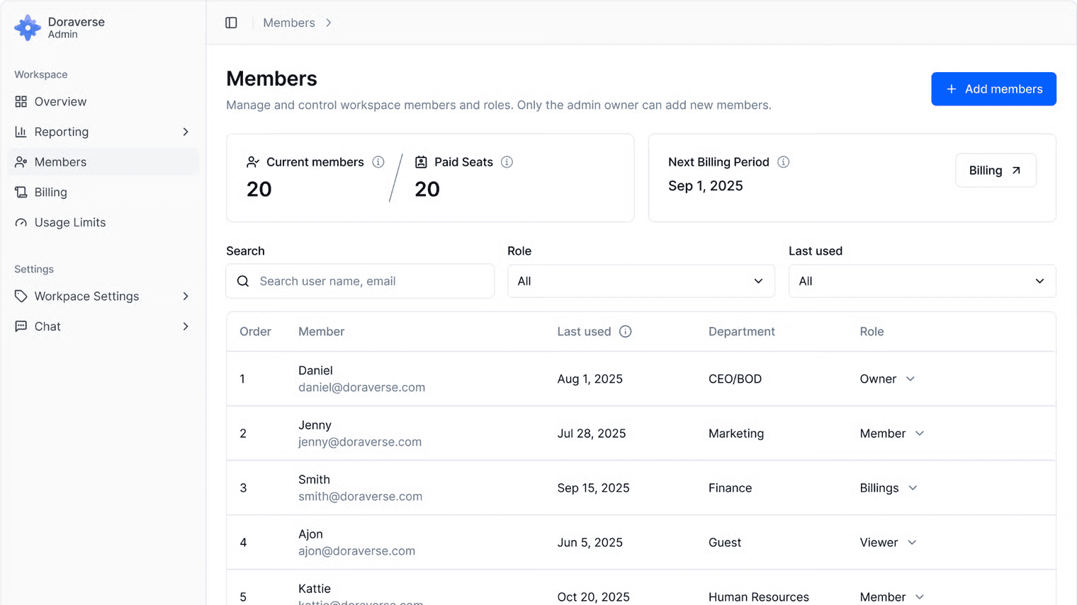 The Member Management tab is where you control and organize workspace members in Doraverse. Navigate to: Account → Admin Settings → Members