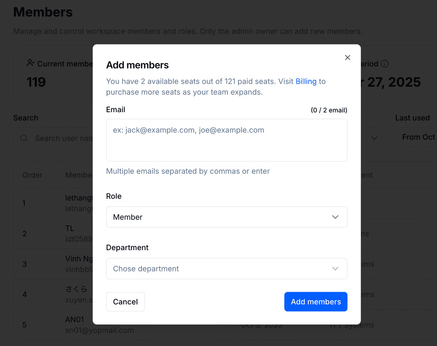 📌 Note: You can only add members based on the number of available seats in your workspace.