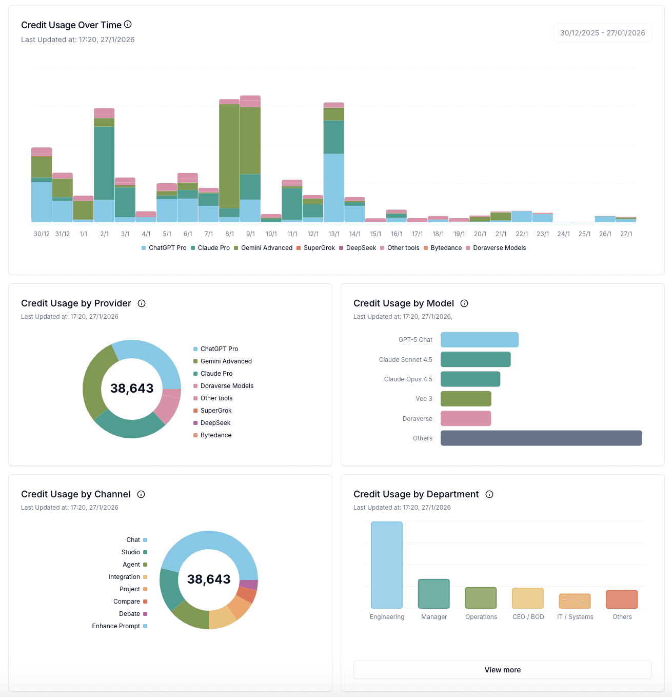 Credit Usage by Model: A chart displaying the allocation of total credit usage by model, supporting decisions to balance cost and effectiveness.