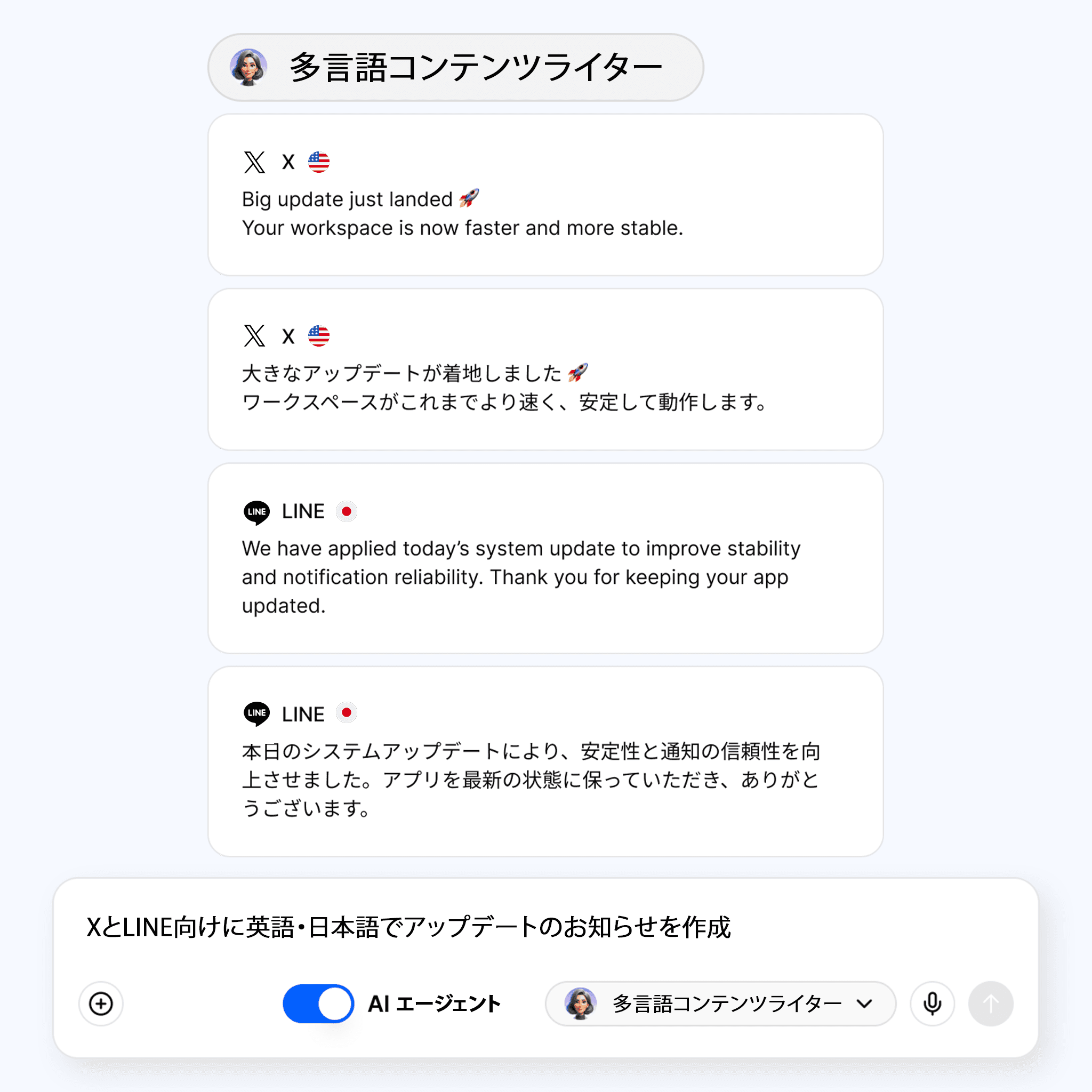 プロンプトライブラリや事前に用意されたテンプレート、AIエージェントにより、「何から始めるか分からない」状態を解消します。