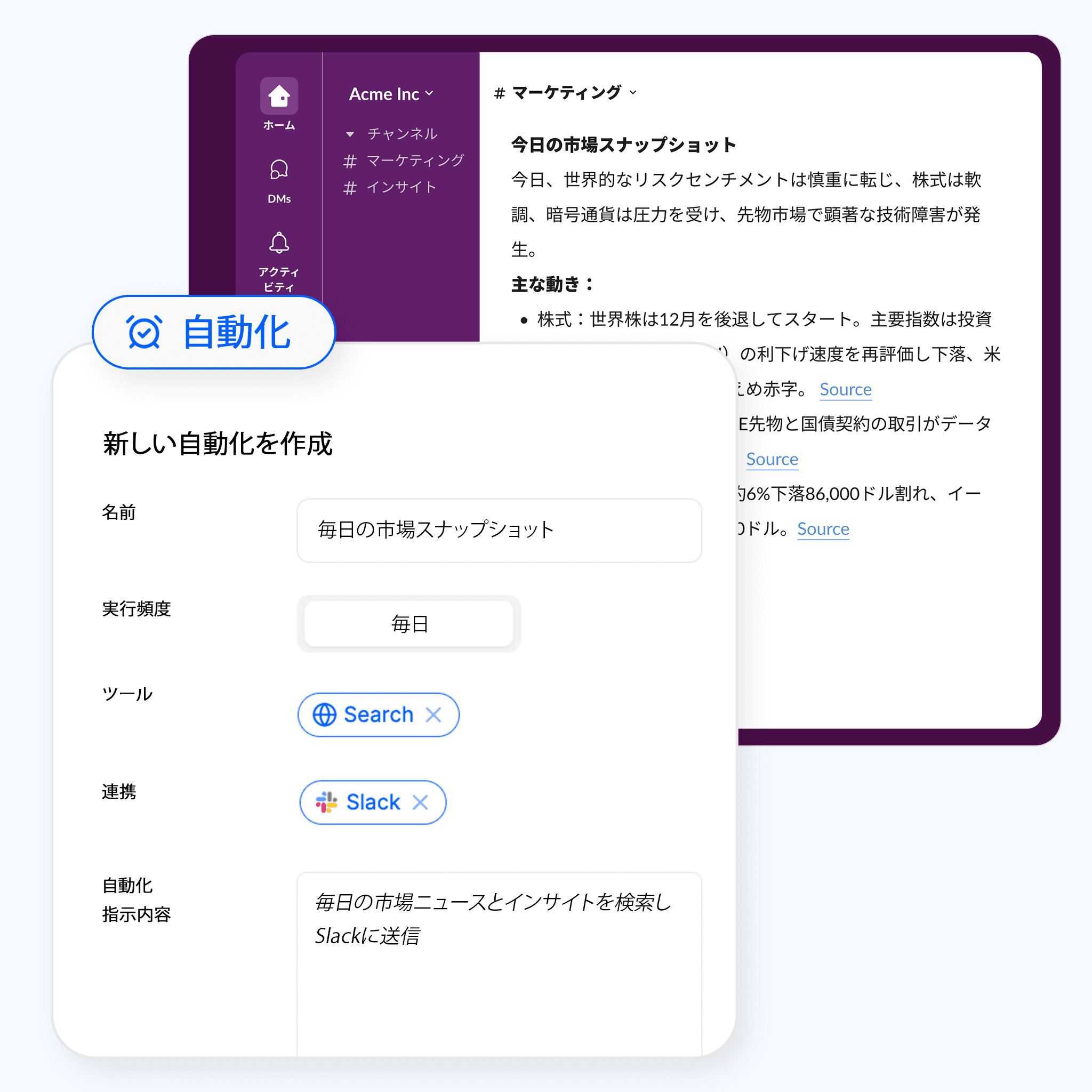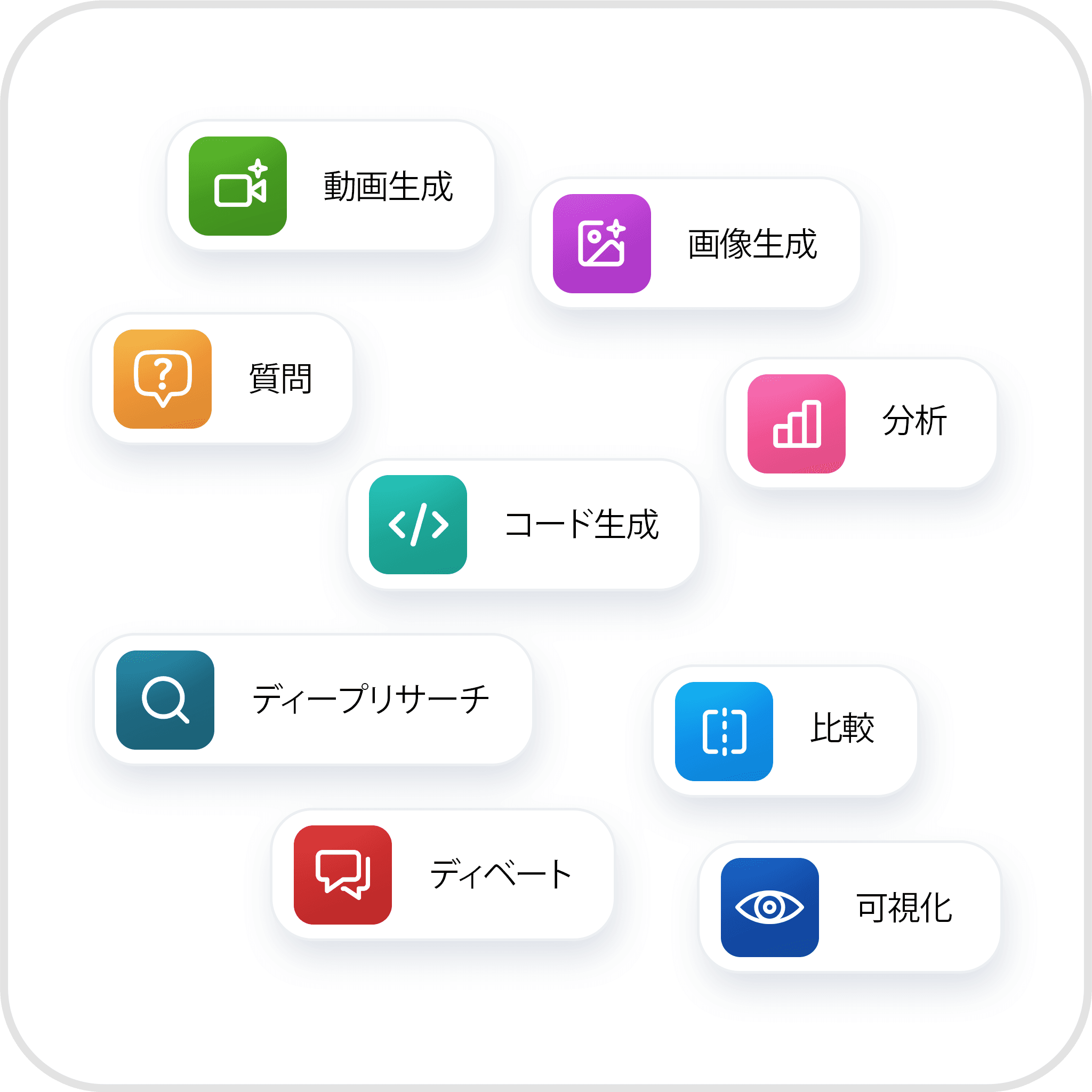世界トップクラスのAIモデルと業務向けAIツールを、安全な一つのワークスペースに統合。チームの切り替え作業を最小限に抑えます。