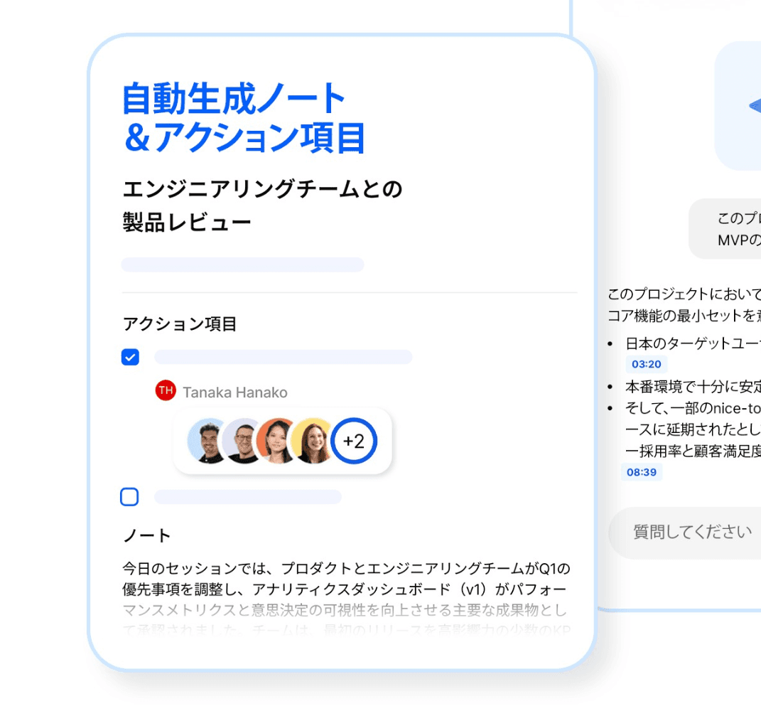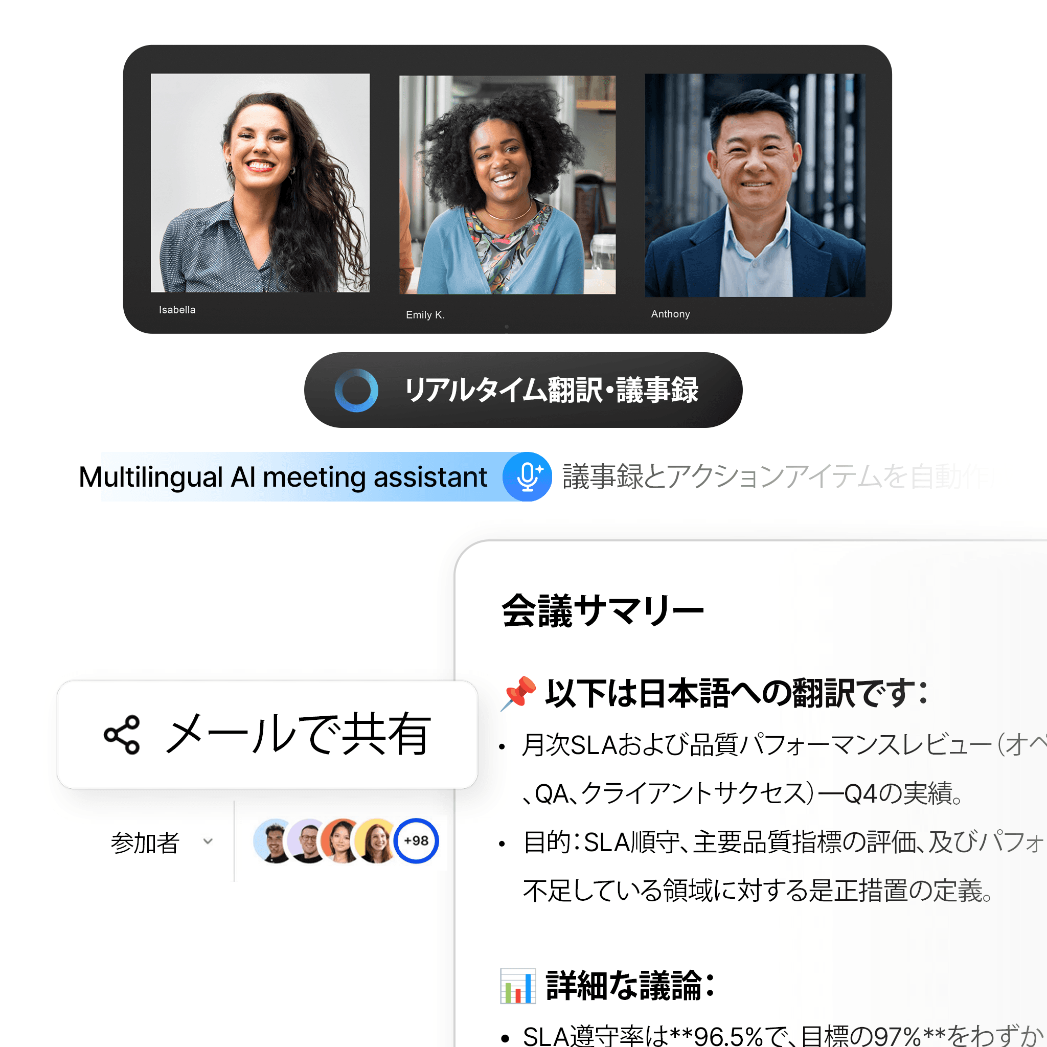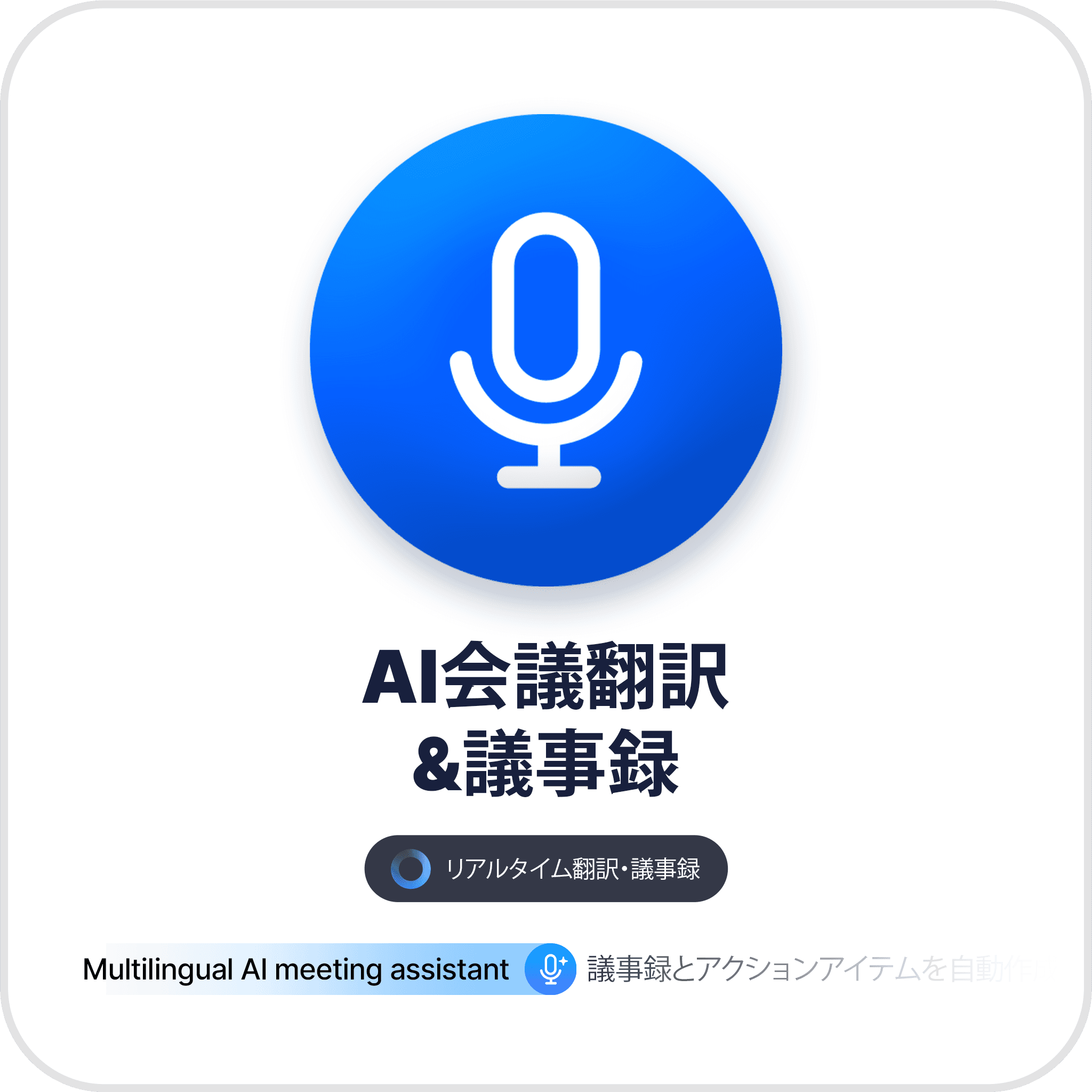 多言語対応のAI会議アシスタントが、リアルタイム翻訳・議事録作成・要約共有までを一気にサポートします。