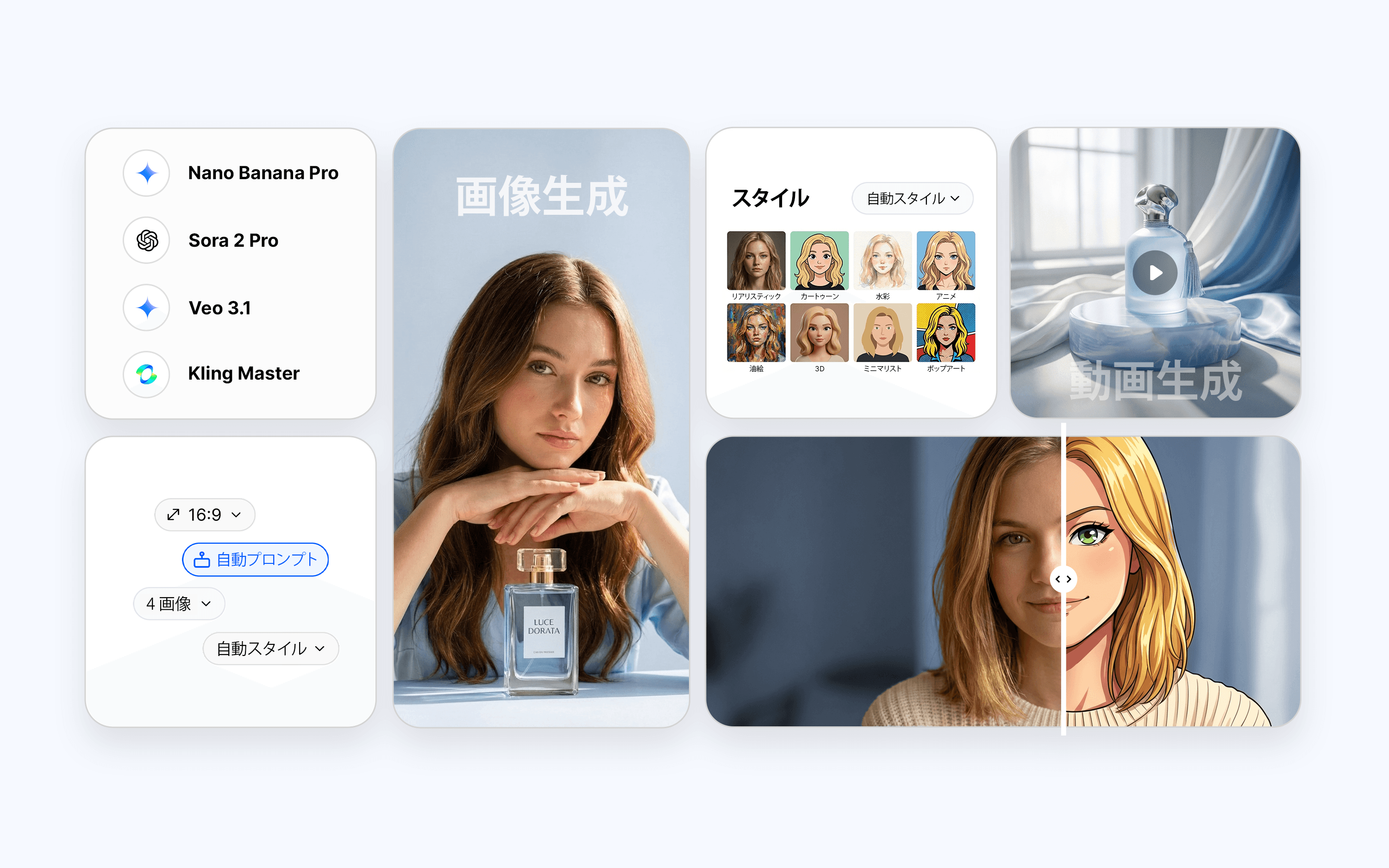 制作スピードを落とさず、品質はそのまま。ブランドに合った画像・動画をAIで瞬時に生成し、アウトプット量を大幅に高めます。