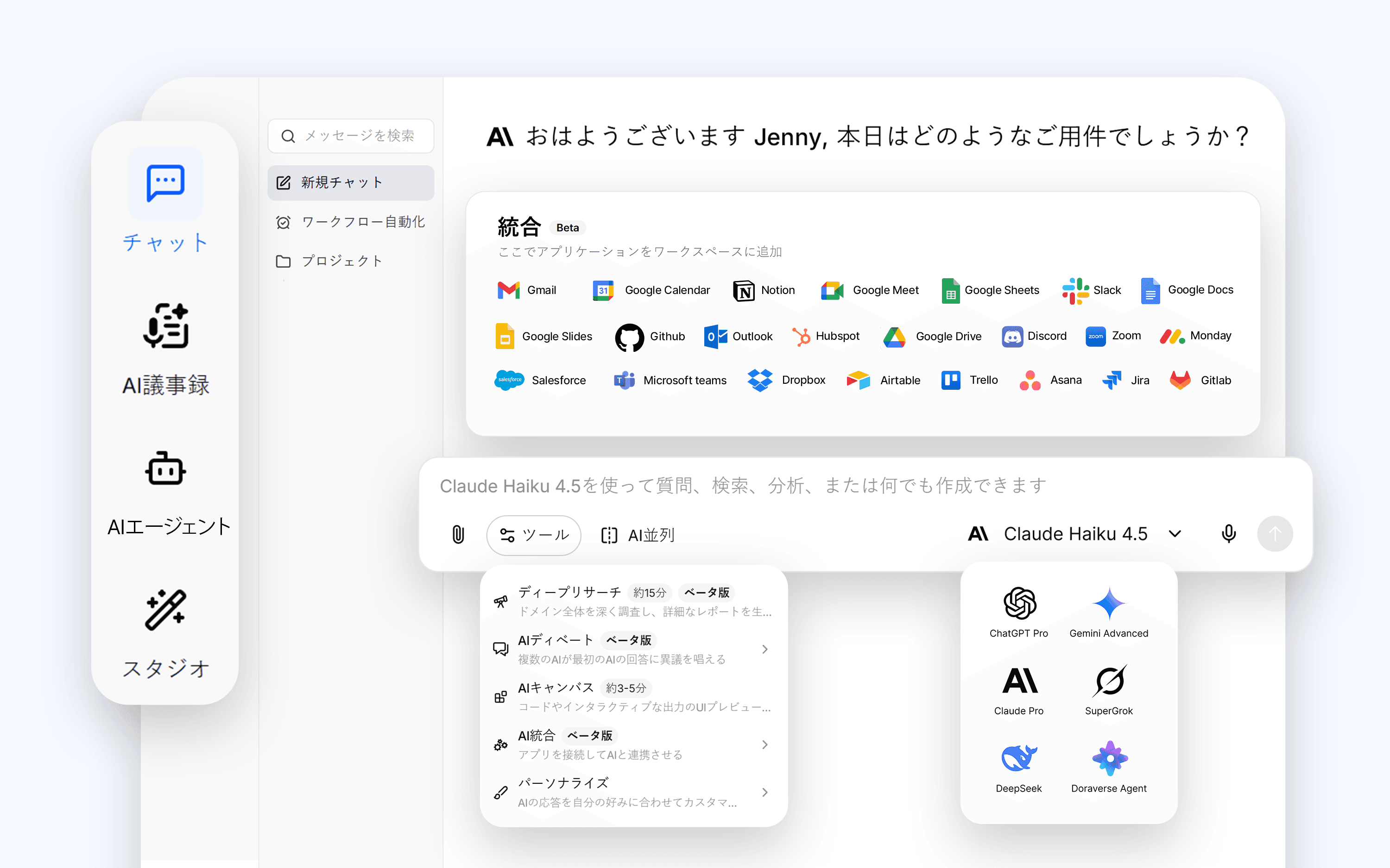 複数ツールをばらばらに使う場合、チームごとに利用方法が異なり、ガバナンスが難しくなります。Doraverse は AI利用、アクセス制御、データ管理、監査を 1 つに統合し、運用リスクを軽減し、コストを削減し、全社的なAI 活用を管理しやすくします。