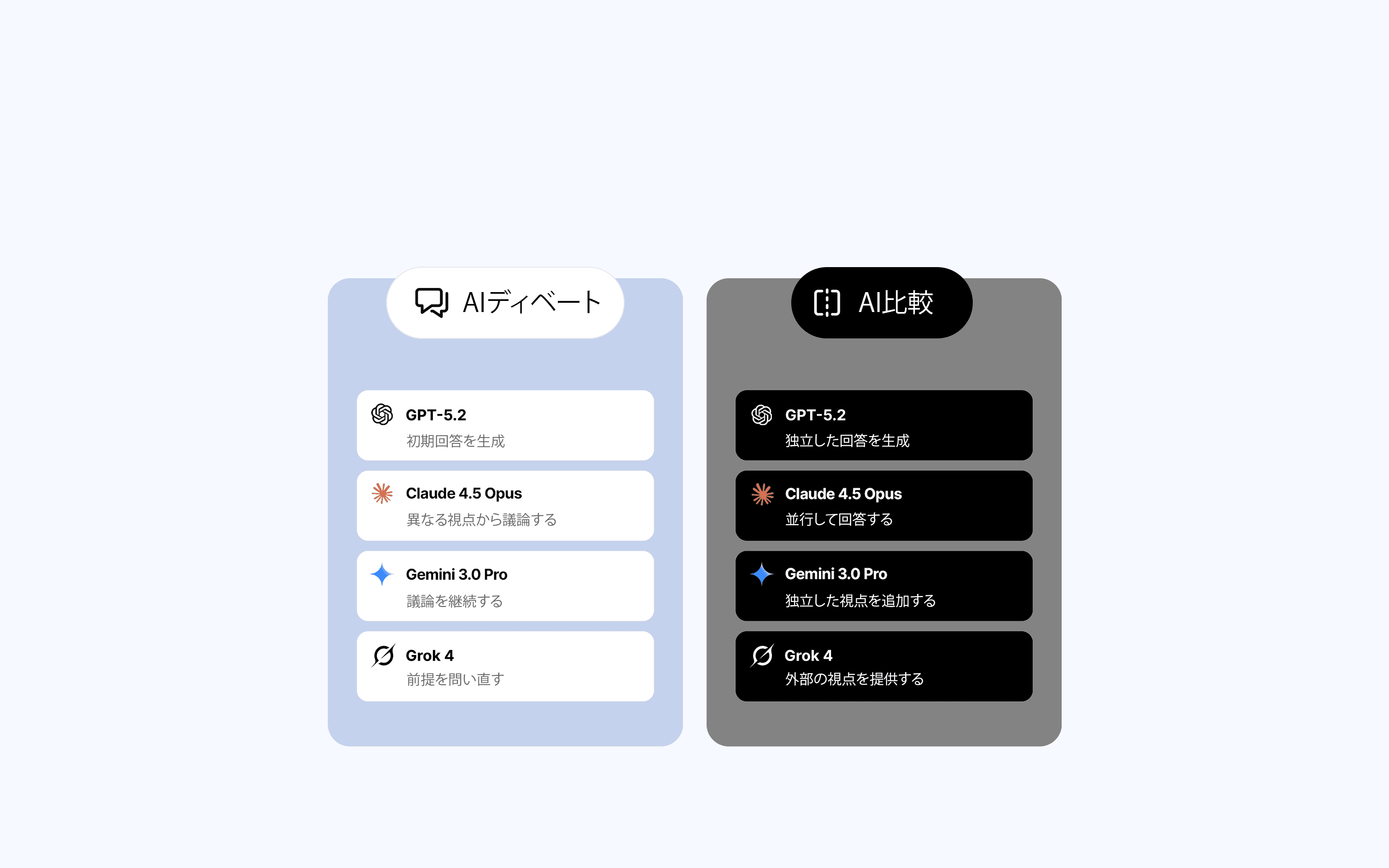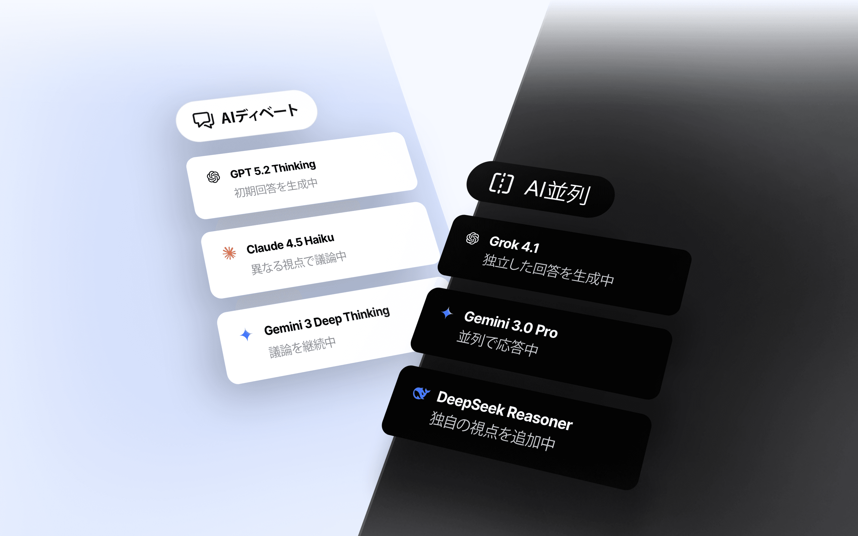 複数のAIが同時に考え、議論し、答えを比較。ひとつのAIではたどり着けない、より納得感のある結論を導きます。