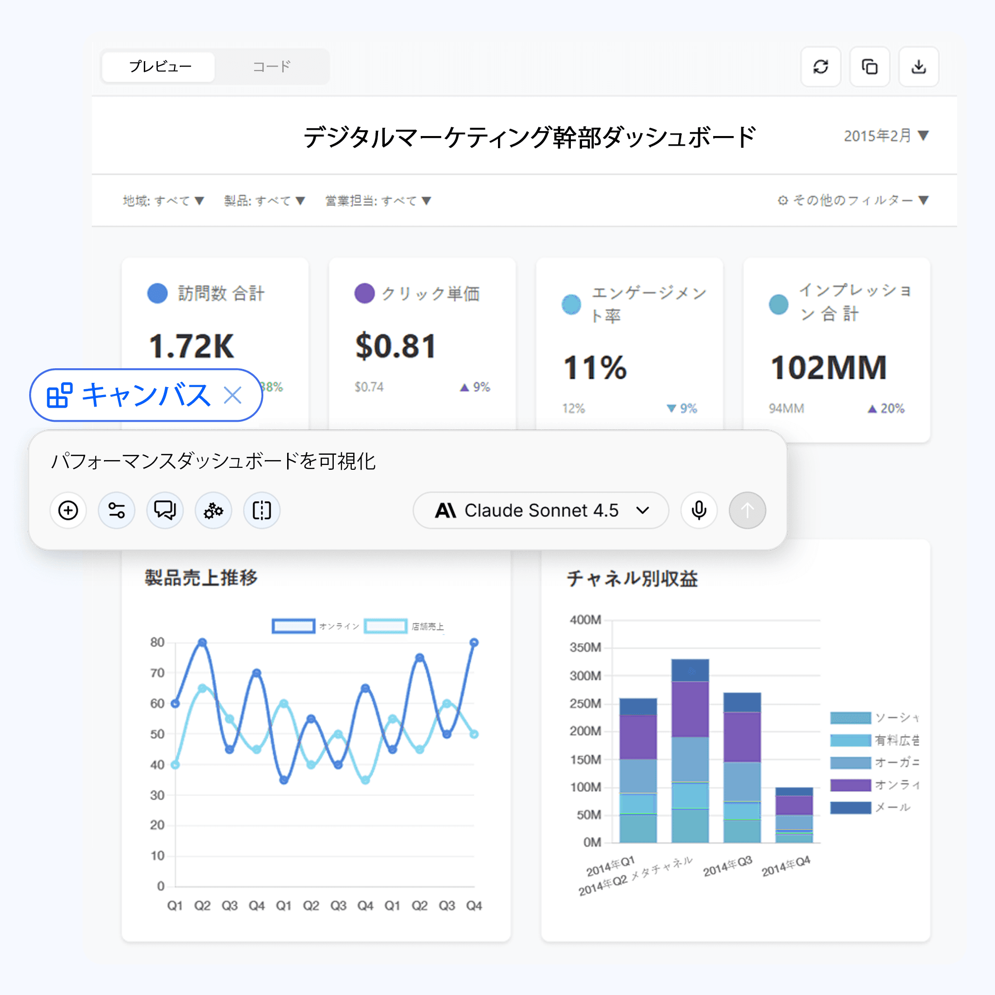 アイデアを指示ひとつでビジュアル化。ダッシュボードやワイヤーフレーム、Webページまで、そのまま使える形で一気に作成できます。