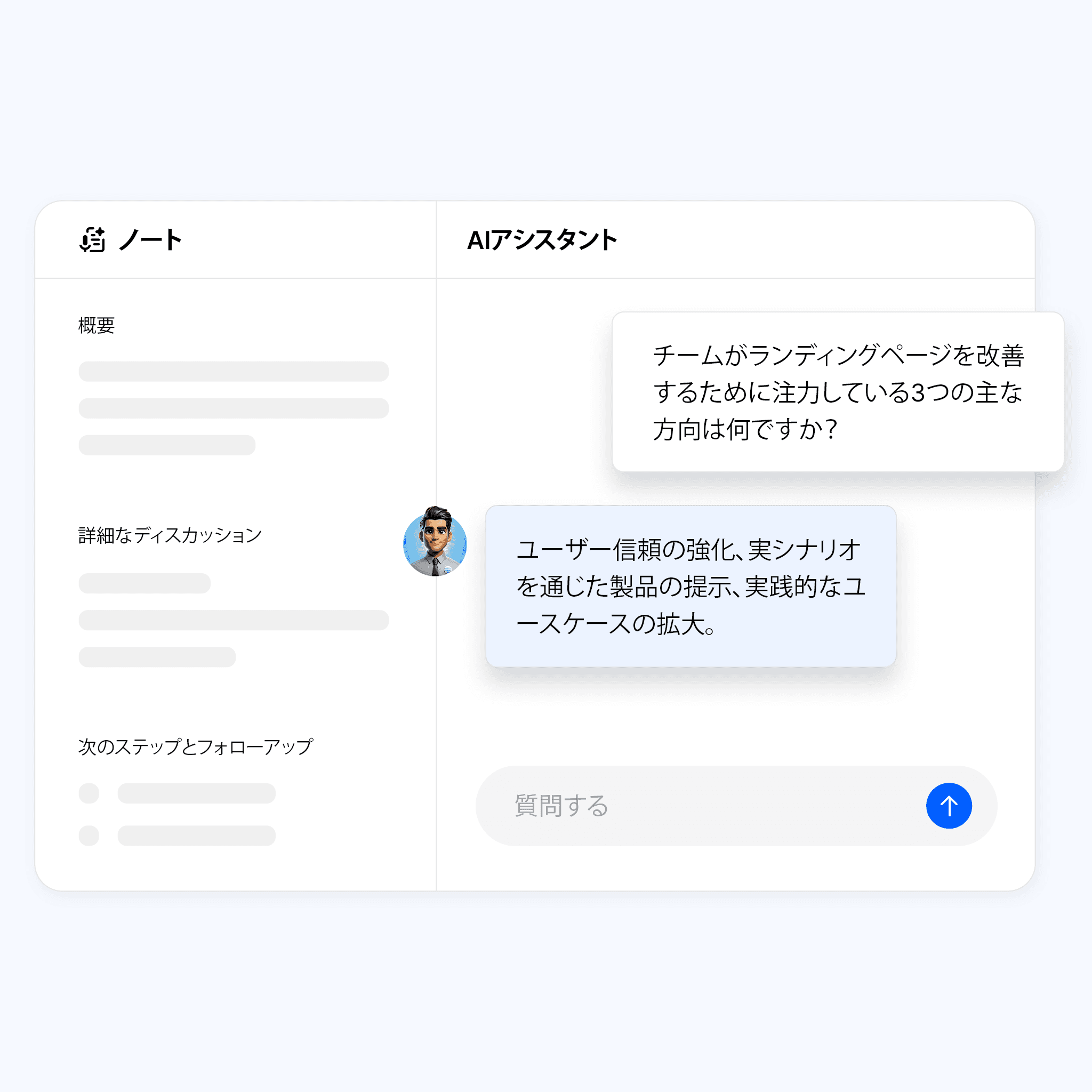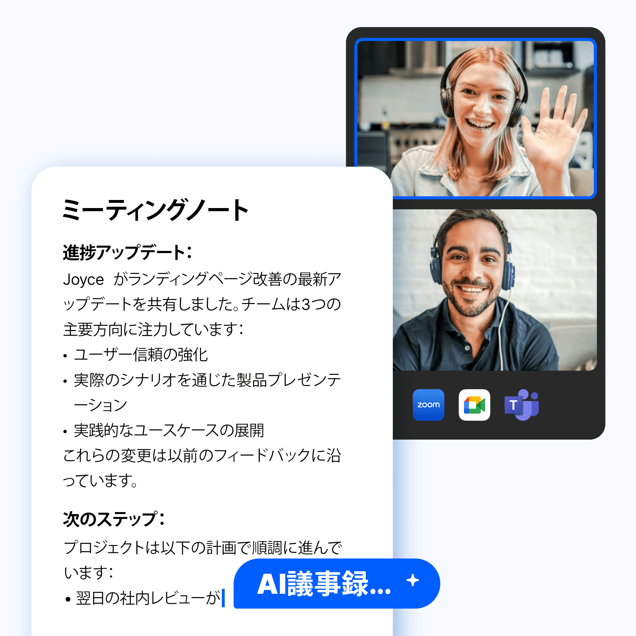 会議内容を記録し、重要事項を特定・正確に要約。メモ取りに縛られず、会話に集中できます。