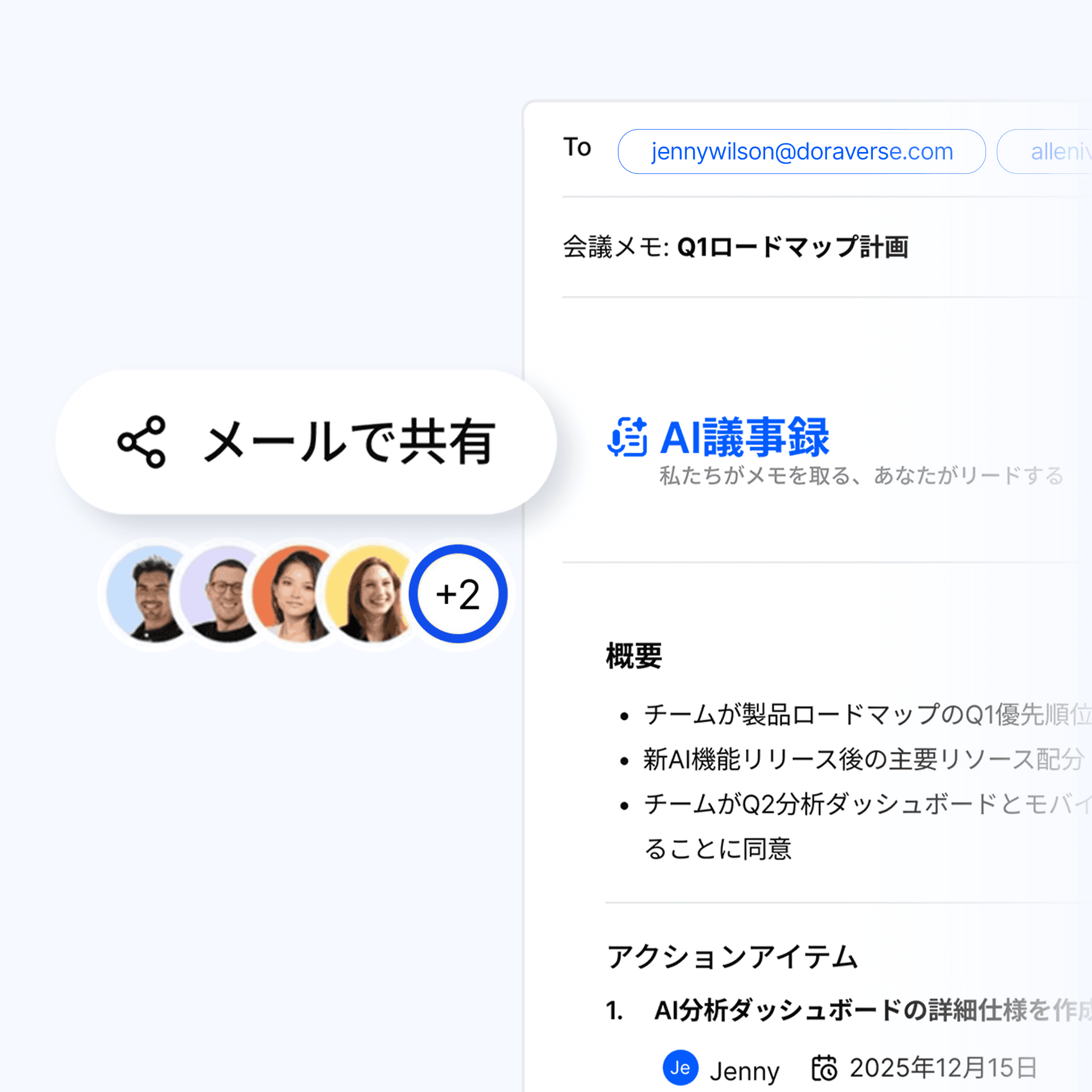 メモやアクションアイテムをメールやワークスペースで簡単に共有。事務作業を減らし前進に集中。