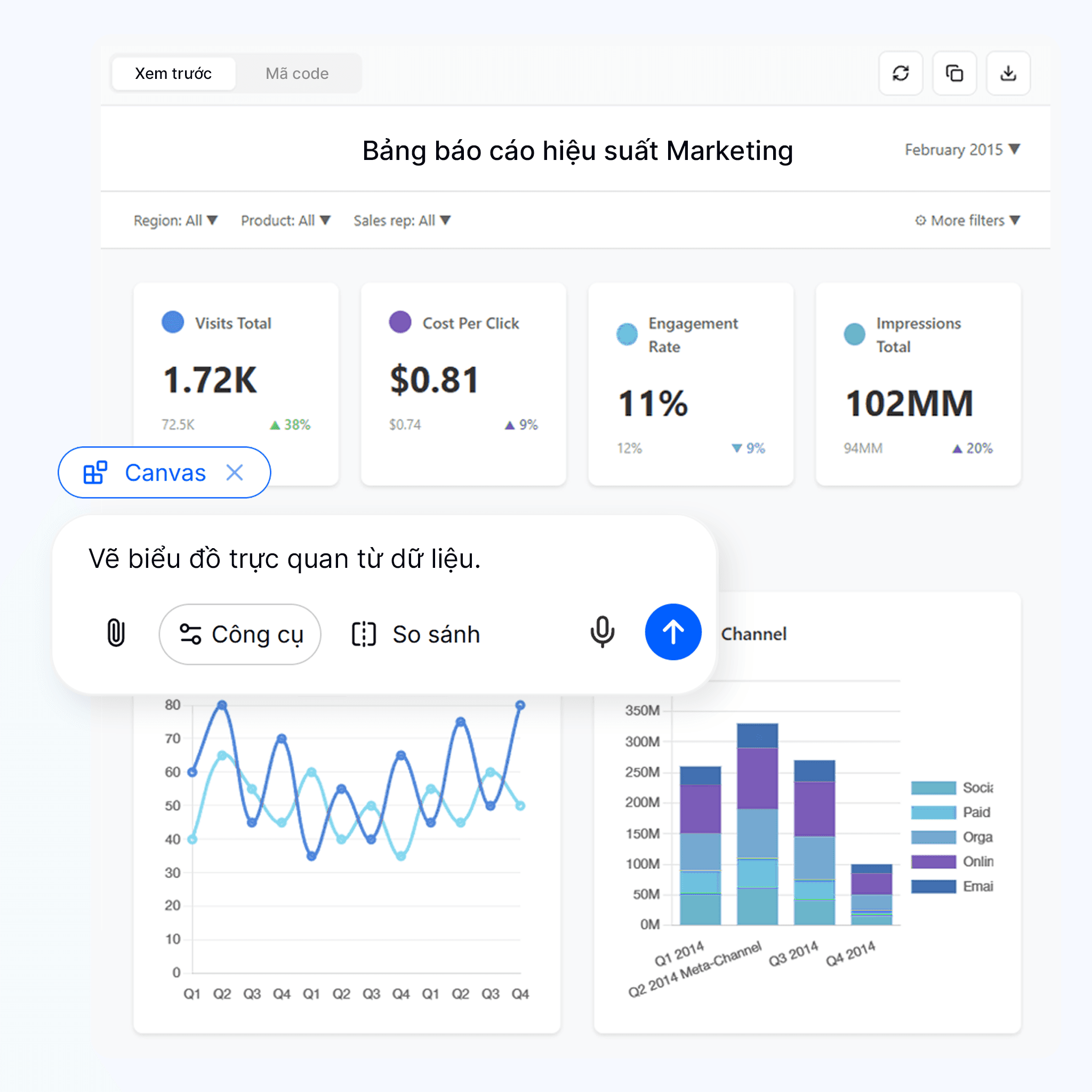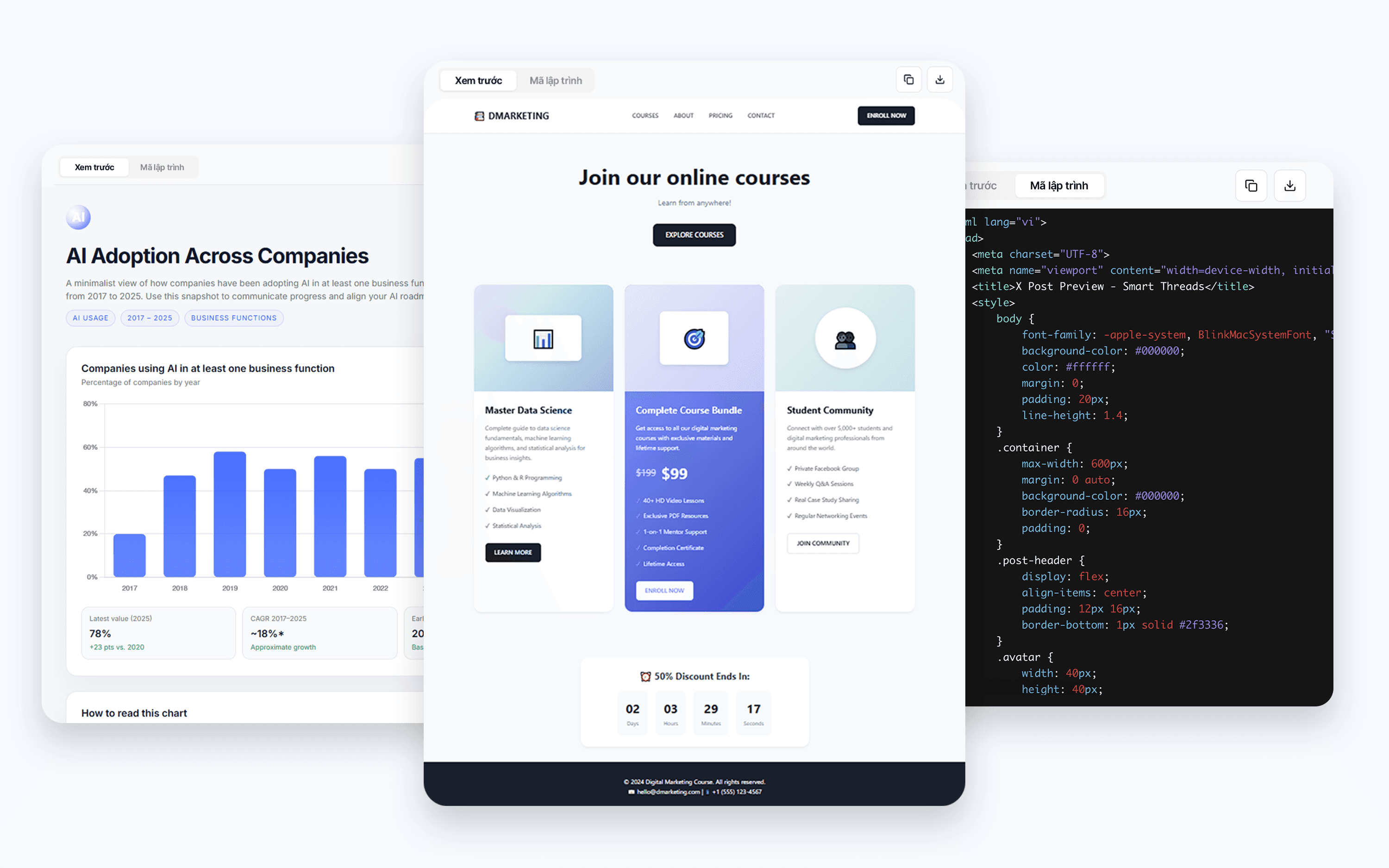 Biến mọi ý tưởng thành sản phẩm trực quan chỉ với một câu lệnh, từ dashboard, wireframe đến trang web, kèm tệp html sẵn sàng để sử dụng.